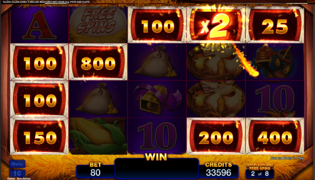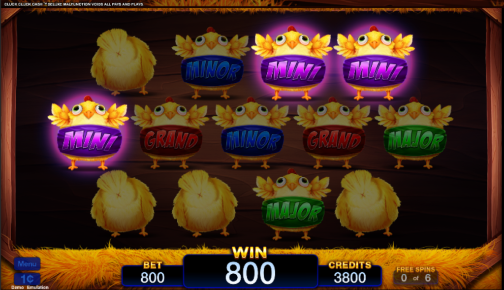 - Triggered by Wild Corn symbols, players are presented with 13 chickens holding one of four jackpot symbols. They then touch each chicken until they find three matching jackpot symbols.