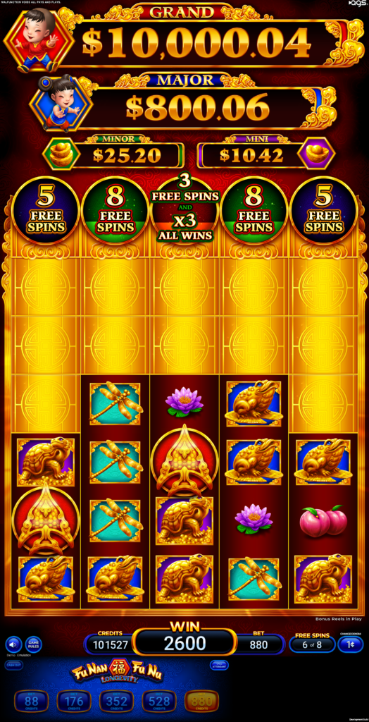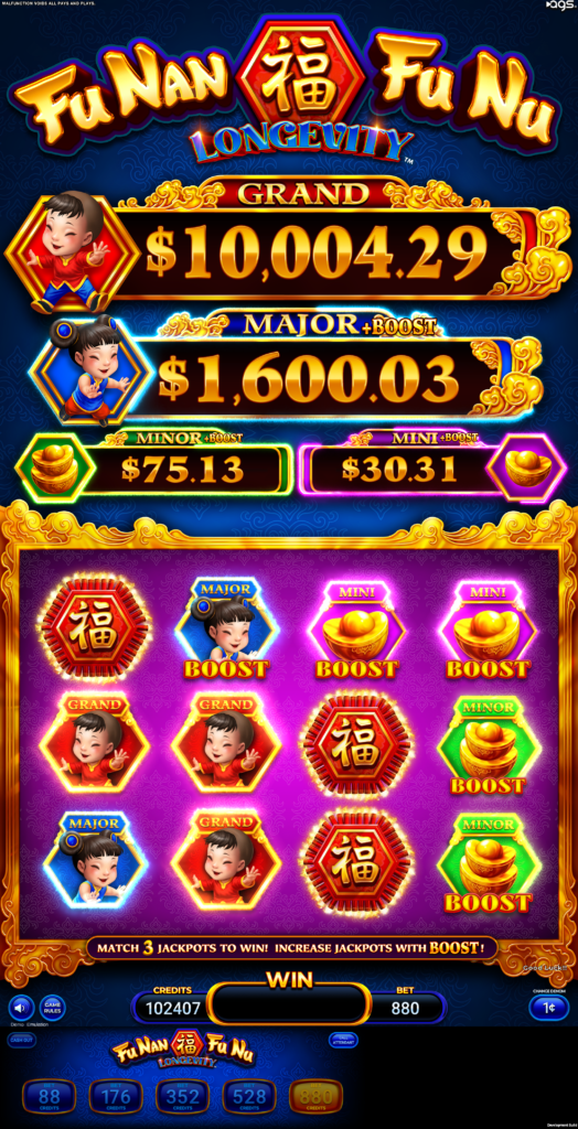 The lucky boy (Fu Nan) and lucky girl (Fu Nu) are igniting good fortune in Fu Nan Fu Nu Longevity™, a brand extension of the popular game family Fu Nan Fu Nu™. The colorful firecrackers light up at the sign of riches in the form of four bonuses.